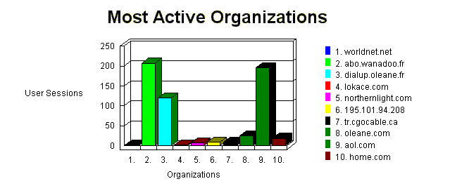 Voici quelques statistiques sur le serveur réalisées le 2 septembre 1999. Elles portent sur les visites du serveur en Août. Rappelons que nous ne faisons pas de pub pour le site. Merci de votre fidélité. Allez, on se lance en anglais/américain/australien/canadien et néo-zélandais... Here are some stats about the server. We do not advertise the site. Thanks for coming here (even if we speack french...). The stats are in english. Enjoy... or have fun. What ever... |