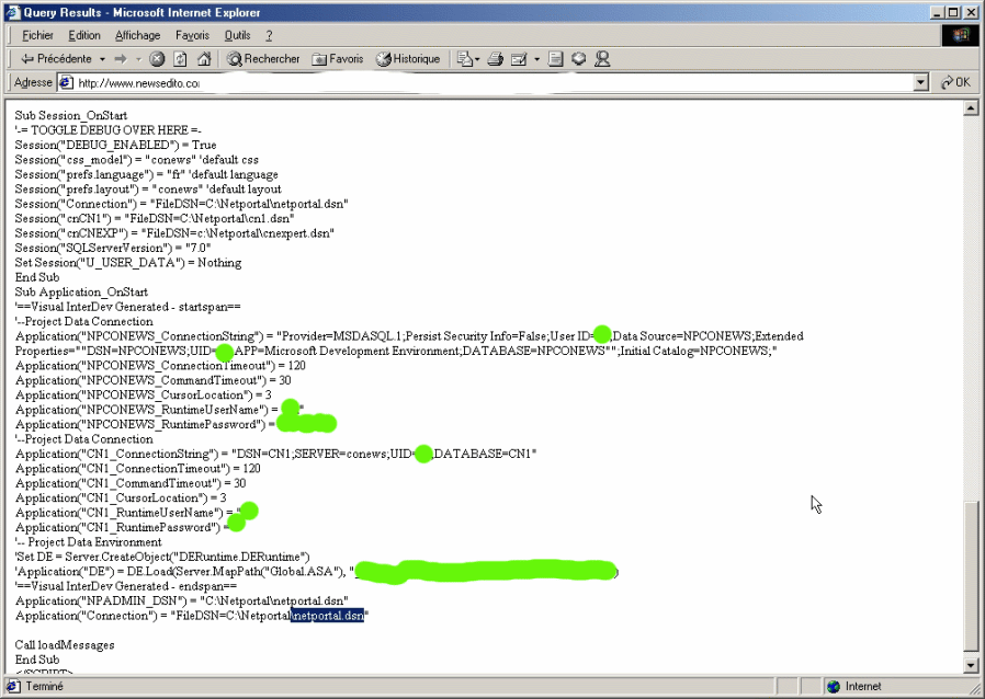Fluxus, hébergeur très connu (pour la qualité de ses prestation... pour une fois on rigole pas) a un peu merdé. Pour annoncer aux journalistes l'arrivée sur le e-marché de NewsEdito ("portail d'information entièrement personnalisable dédié aux journalistes") Fluxus s'est vraiment lâché dans le genre e-bla-bla à l a manière du Journaldunetpasnet. On peut ainsi lire (outre les considérations marketingo-ridicules sur la pertinece -bien entendu- du service): "Le site NewsEdito est totalement intégré à la plate-forme d'hébergement dédiée critique déployée par Fluxus pour CompanyNews. Aussi bénéficie-t-elle des mêmes technologies, afin d'assurer une parfaite homogénéité. Le socle commun, sur une base NT4, se compose d'une base de données SQL server 7 en Raid 5, un serveur de back office qui permet la réactualisation permanente des informations, et de trois serveurs frontaux, dotés d'un système de répartition des charges (load balancing) Alteon. En outre, NewsEdito utilise un serveur front-office dédié afin d'héberger les applications qui lui sont spécifiques. L'ensemble dispose d'une capacité de bande passante illimitée. Les équipes de Fluxus assurent la supervision 24X7, à l'aidse notamment d'outils comme Nocol, pour chacun des modules applicatifs et chaque URL". Mouais... On dirait la plate-forme de contrôle de la dernière mission vers Mars de la Nasa. Et encore, je me souviens de code source qui s'échangeait sur l'irc.... Mais c'est une autre histoire. Bref. Revenons à NewsEdito... Avec une telle description, nous on s'est dit que cela valait la peine d'aller regarder de près. Bilan des courses, on dirait que les logins et les mots de passe de la base de données associée au site ne sont pas tout à fait protégée façon méga surveillance 24/7. En tout cas, ils n'ont pas décelé nos visites puisqu'ils n'ont pas réparé avant notre mail. Y'a du boulot... ;) |