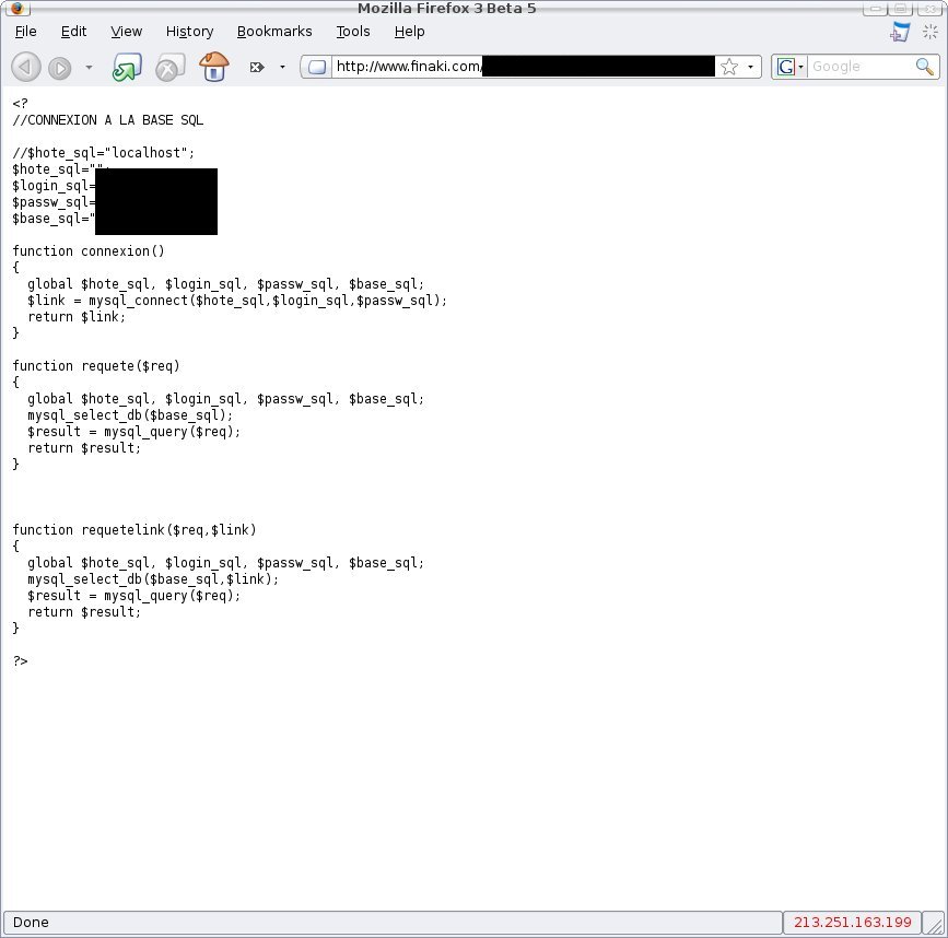 Comme quoi, pour faire rire dans le domaine informatique, et Kitetoa.com n'a cessé de le prouver depuis 1997, il suffit de demander aux acteurs du secteur. Plus ils se présentent comme des experts, plus ils négligent la sécurité de leurs sites. Nous avons épinglé ici des banques, des consultants en pagaille. Pour ne pas rompre la tradition, nous nous intéressons cette fois à la société Finaki. Que dit-elle d'elle-même ? « FINAKI, fondée en Mars 1989 par des consultants issus du monde de la recherche en informatique, est spécialisée dans la création et l'organisation de séminaires technologiques de haut niveau. » (...) L'indépendance de notre société alliée à une grande connaissance du monde des nouvelles technologies de l'information communicante (NTIC) nous a permis, dès 1990, de réunir chaque année, en Juin, les Directeurs des Systèmes d'Information des plus grandes entreprises françaises, les dirigeants des principales sociétés d'Informatique pour favoriser un dialogue constructif en organisant les Entretiens Informatiques d'Opio. » Et que dit leur site ? Il dit qu'avec un simple navigateur et sans rien pirater, un internaute peut tomber sur une page qui contient le login et le mot de passe de la base SQL. Encore un effort et la « grande connaissance du monde des nouvelles technologies de l'information communicante (NTIC) » sera complète...